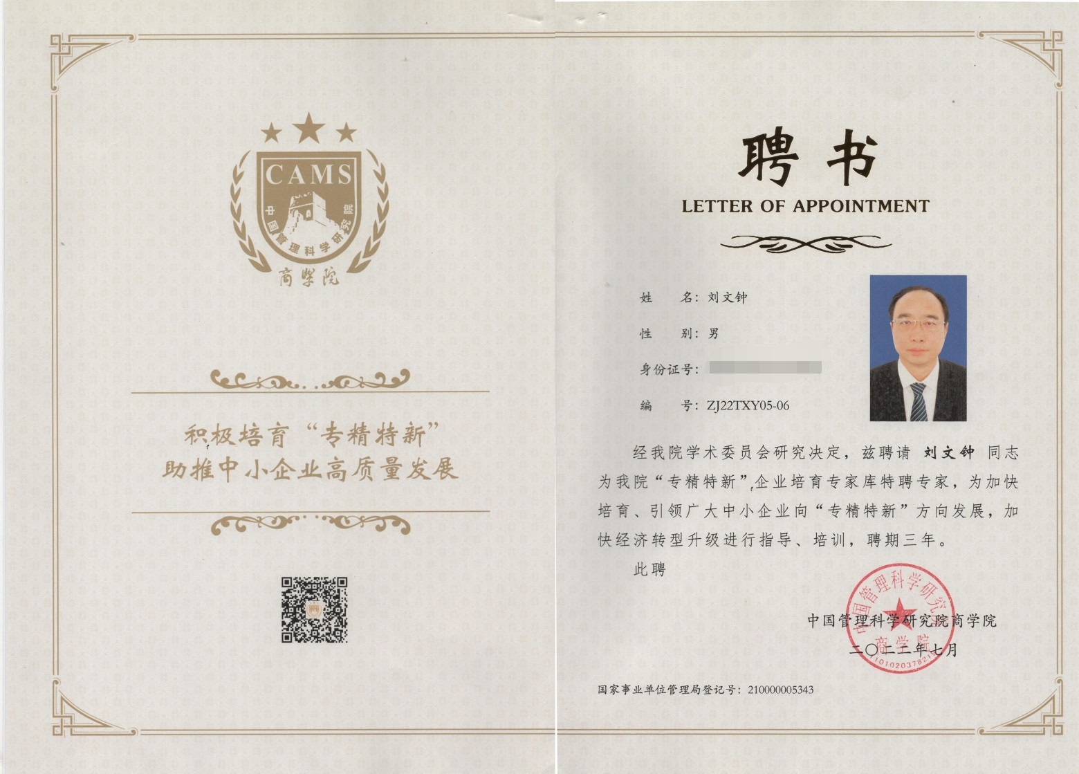 近日,由中国管理科学院审核调研,定向邀请,并结合其他相关指标综合评审,我司董事长刘文钟被聘为中管商学院“专精特新“企业培育专家库特聘专家。